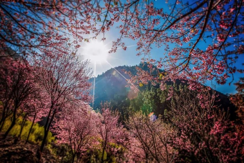 Sau bữa sáng, đoàn khởi hành đi thăm cảnh rừng hoa Anh Đào, với diện tích 260 Ha, quy mô 270.000 cây hoa Anh Đào, đây là một biển hoa ngập màu phấn hồng đậm. Loại giống hoa Anh Đào Vân Nam là loại hoa cao nguyên, với điều kiện tự nhiên trồng ở độ cao 1500 mét trở lên, trong năm ít nhất phải có 72 tiếng đồng hồ là 0 độ thì hoa mới ủ nụ, trải qua mùa đông ủ nụ khi nở là những bông hoa cánh kép dầy, hoa đua nhau nỏ từng búp màu phấn hồng đậm.